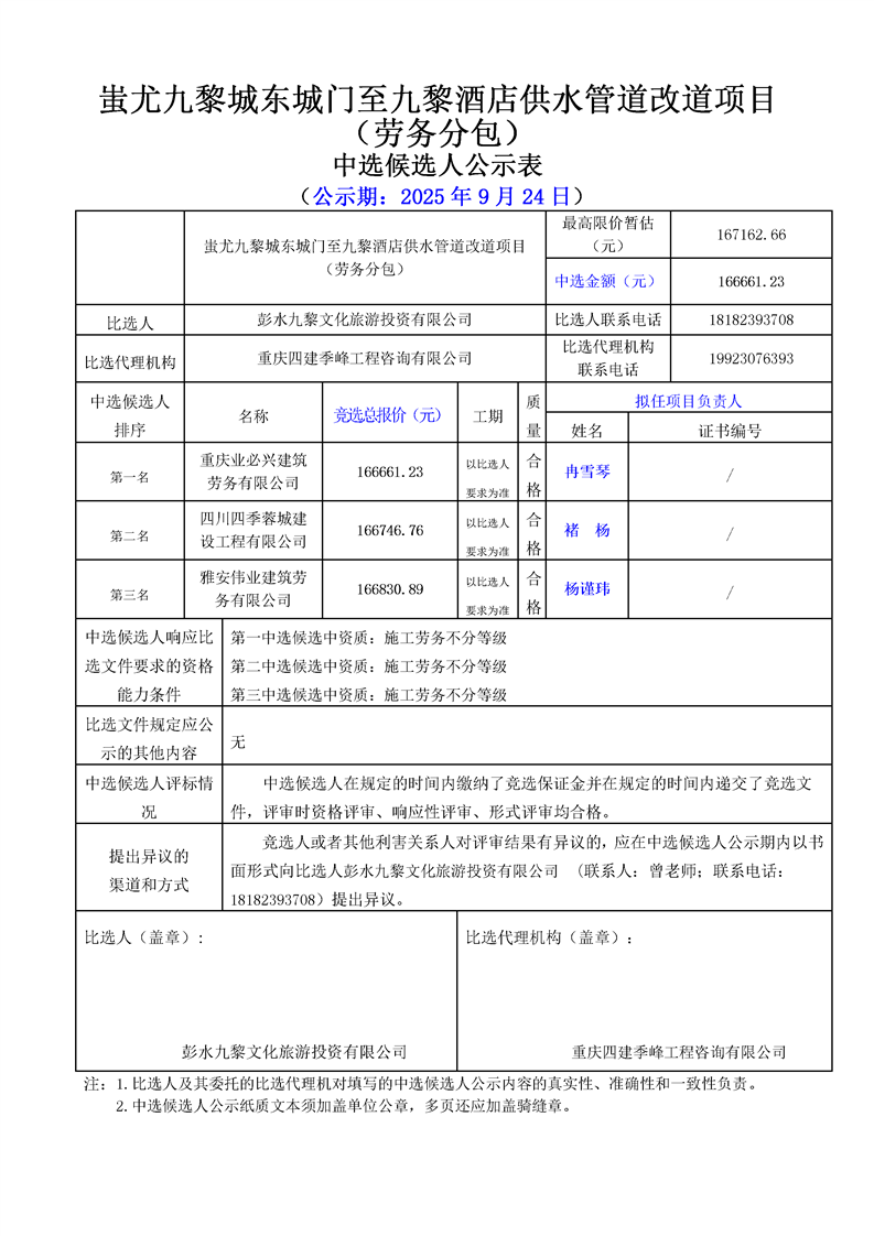 蚩尤九黎城东城门至九黎酒店供水管道改道项目(劳务分包) 中选候选人公示表