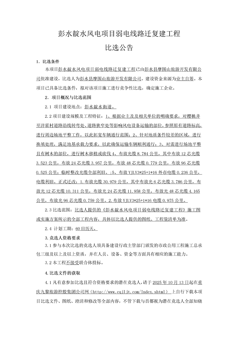 彭水靛水风电项目弱电线路迁复建工程比选公告