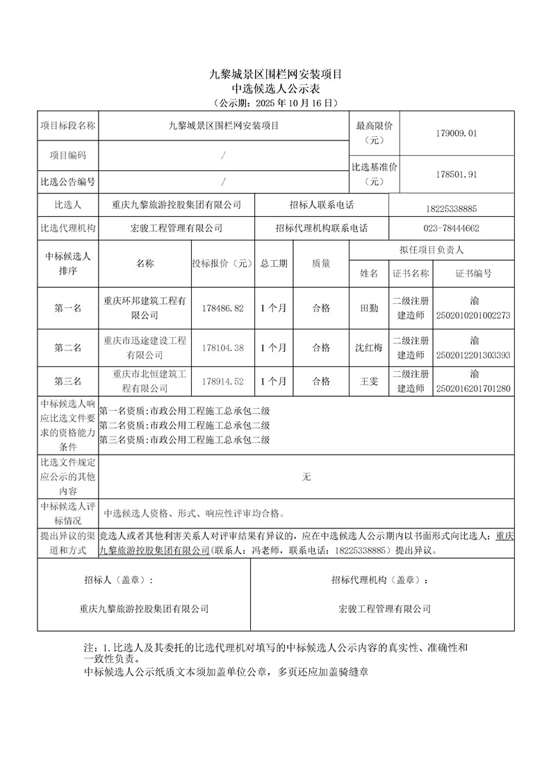 九黎城景区围栏网安装项目中选候选人公示表