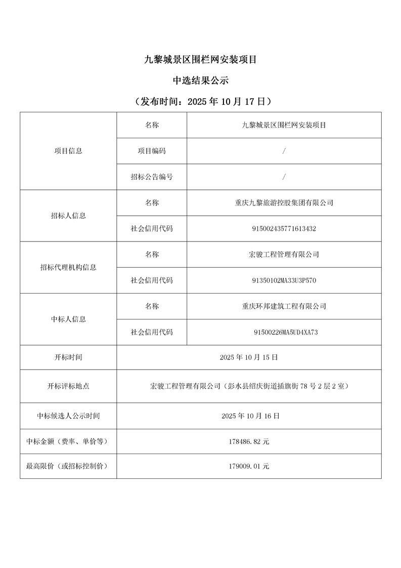 九黎城景区围栏网安装项目中选结果公示