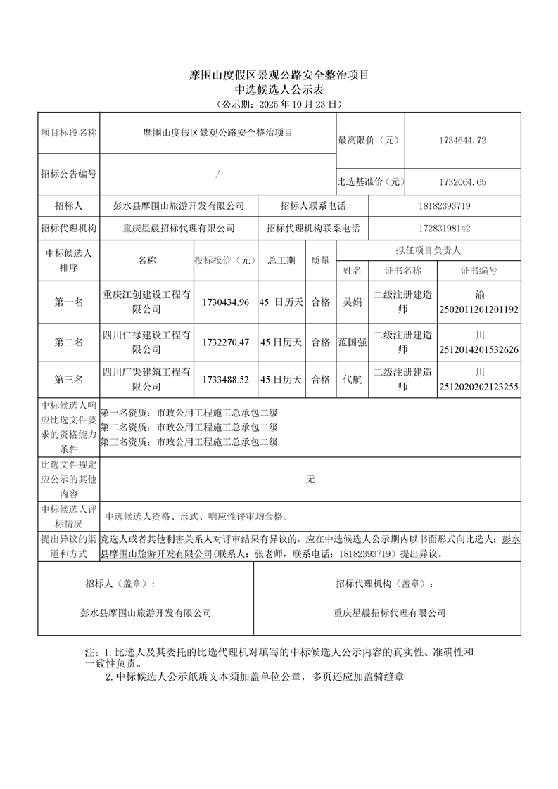 摩围山度假区景观公路安全整治项目中选候选人公示表