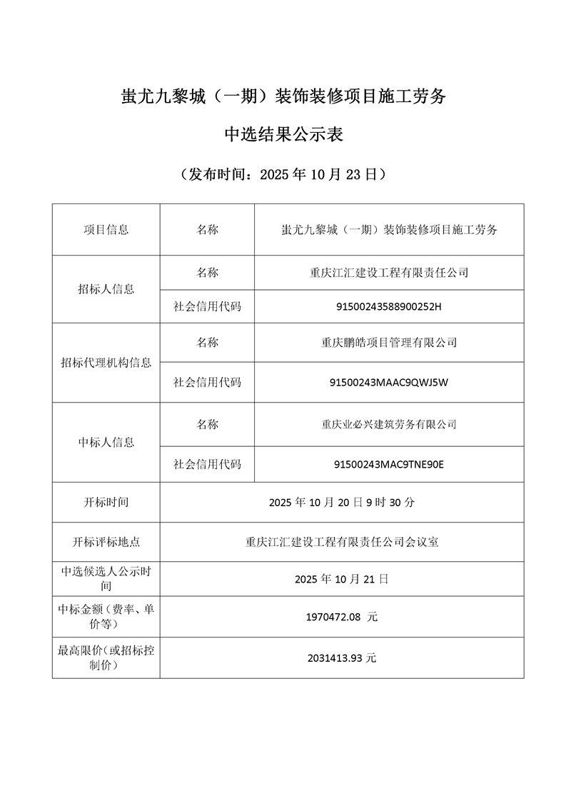 蚩尤九黎城(一期)装饰装修项目施工劳务中选结果公示表