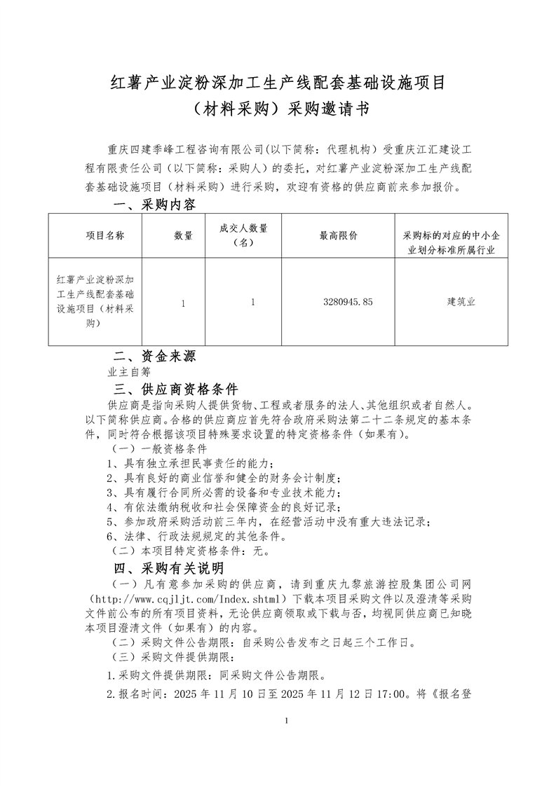 红薯产业淀粉深加工生产线配套基础设施项目(材料采购)采购邀请书