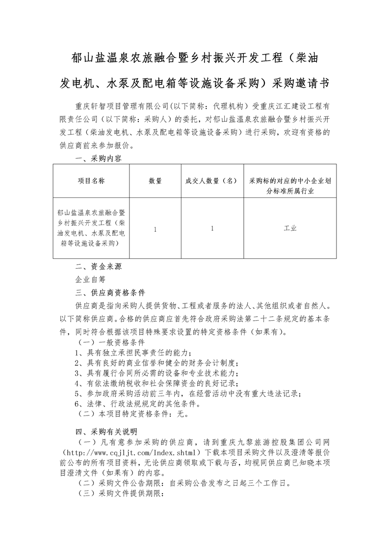 郁山盐温泉农旅融合暨乡村振兴开发工程(柴油 发电机、水泵及配电箱等设施设备采购)采购邀请书