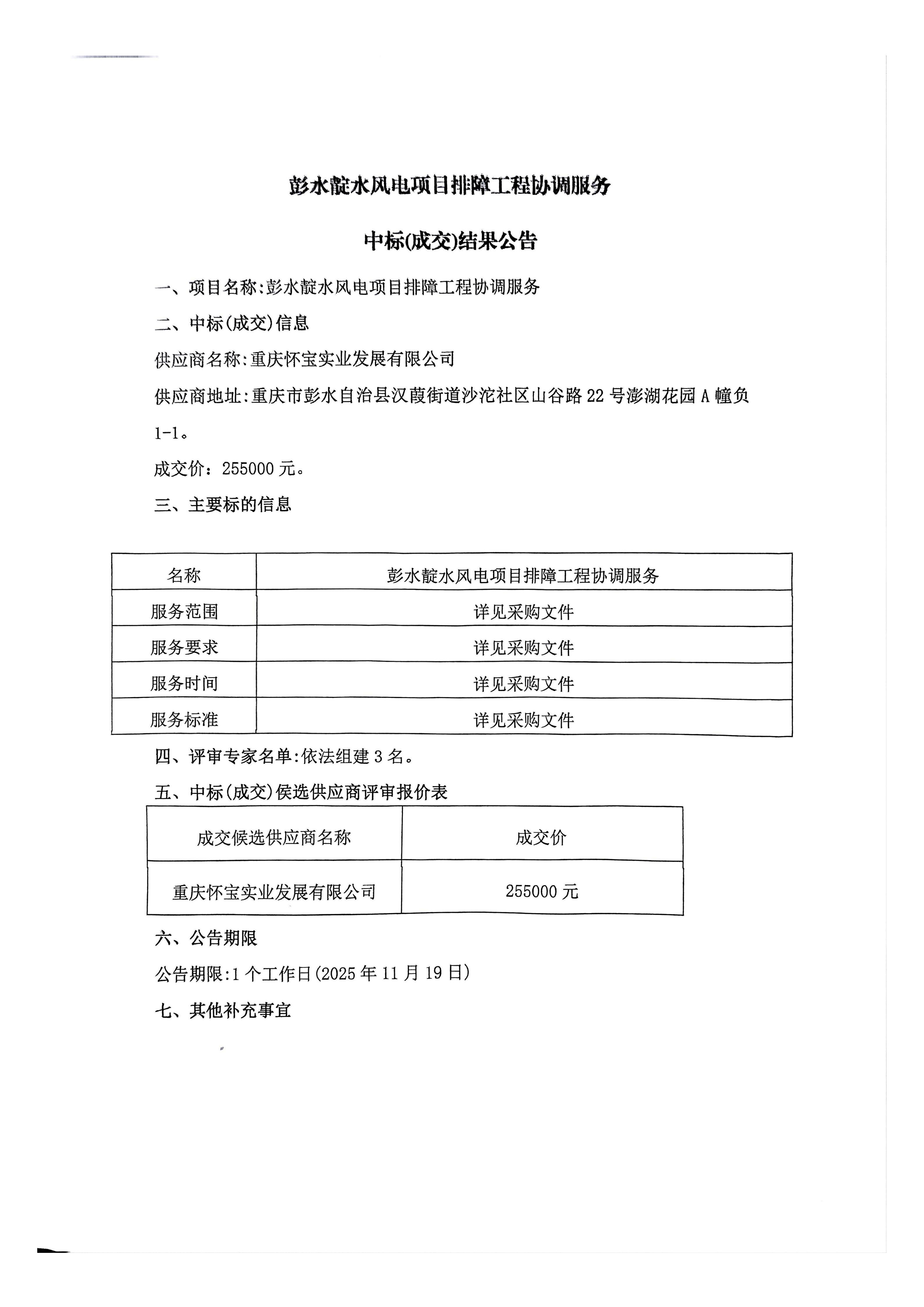彭水靛水风电项目排障工程协调服务中标(成交)结果公告