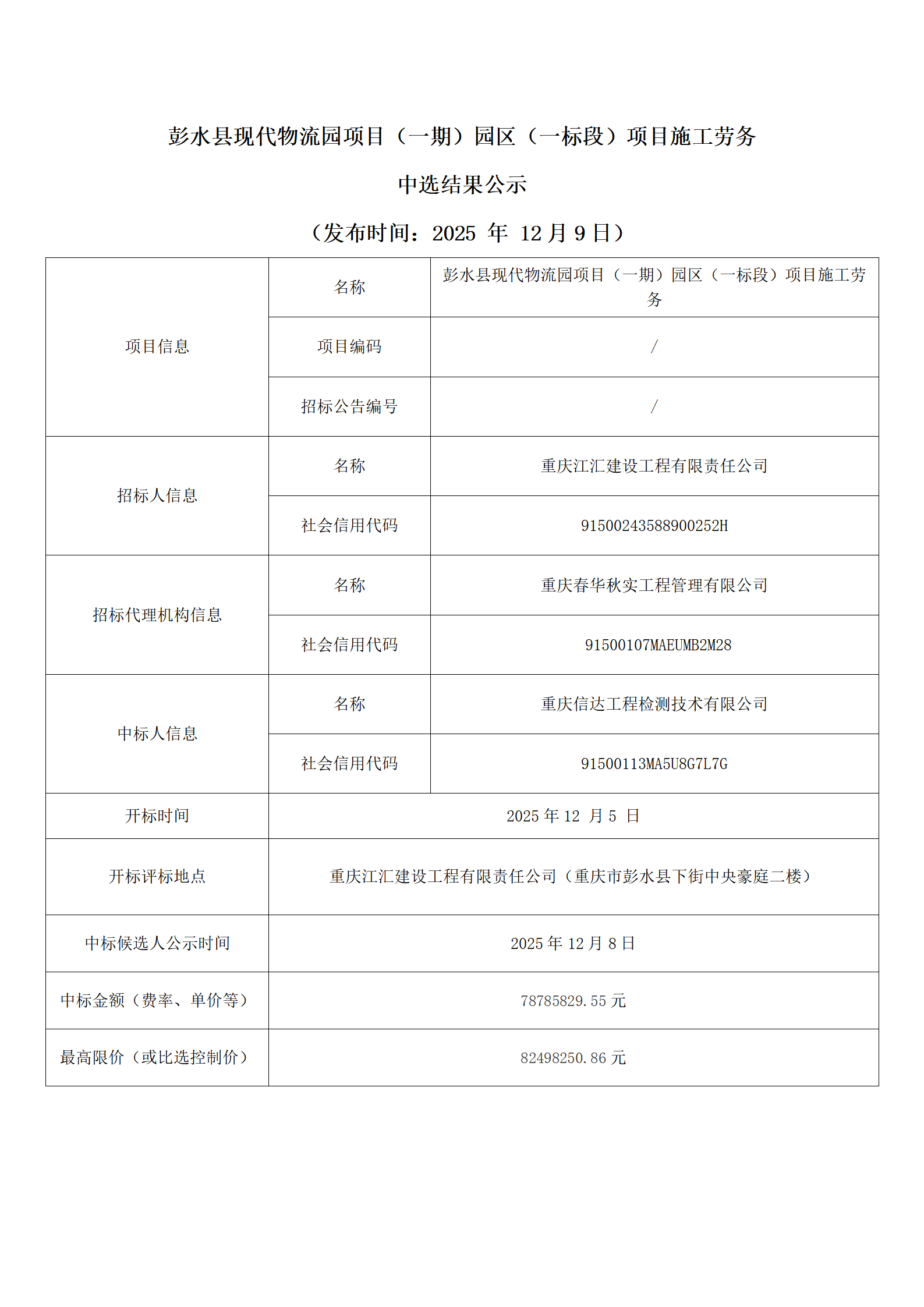 彭水县现代物流园项目(一期)园区(一标段)项目施工劳务中选结果公示