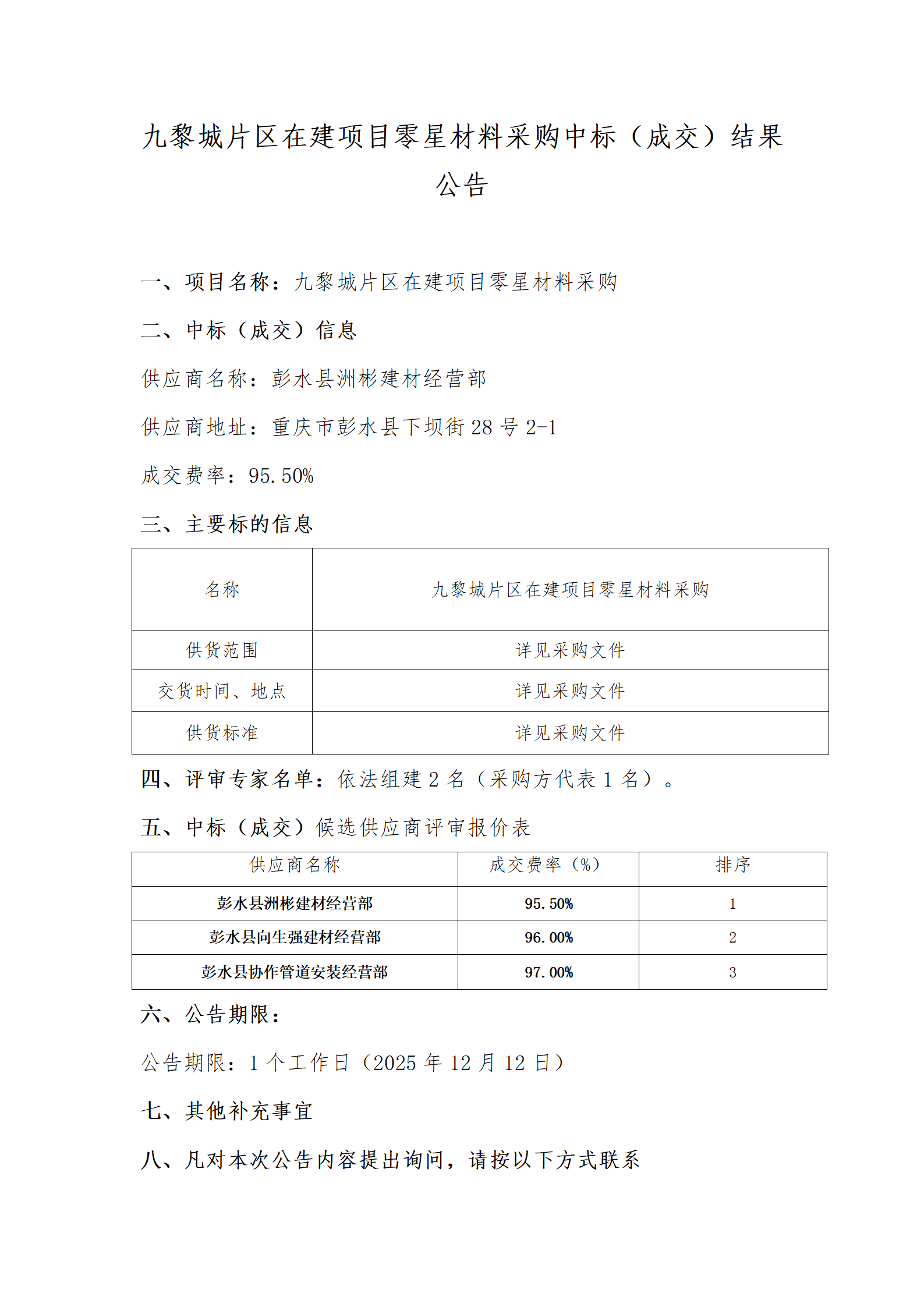 九黎城片区在建项目零星材料采购中标(成交)结果公告