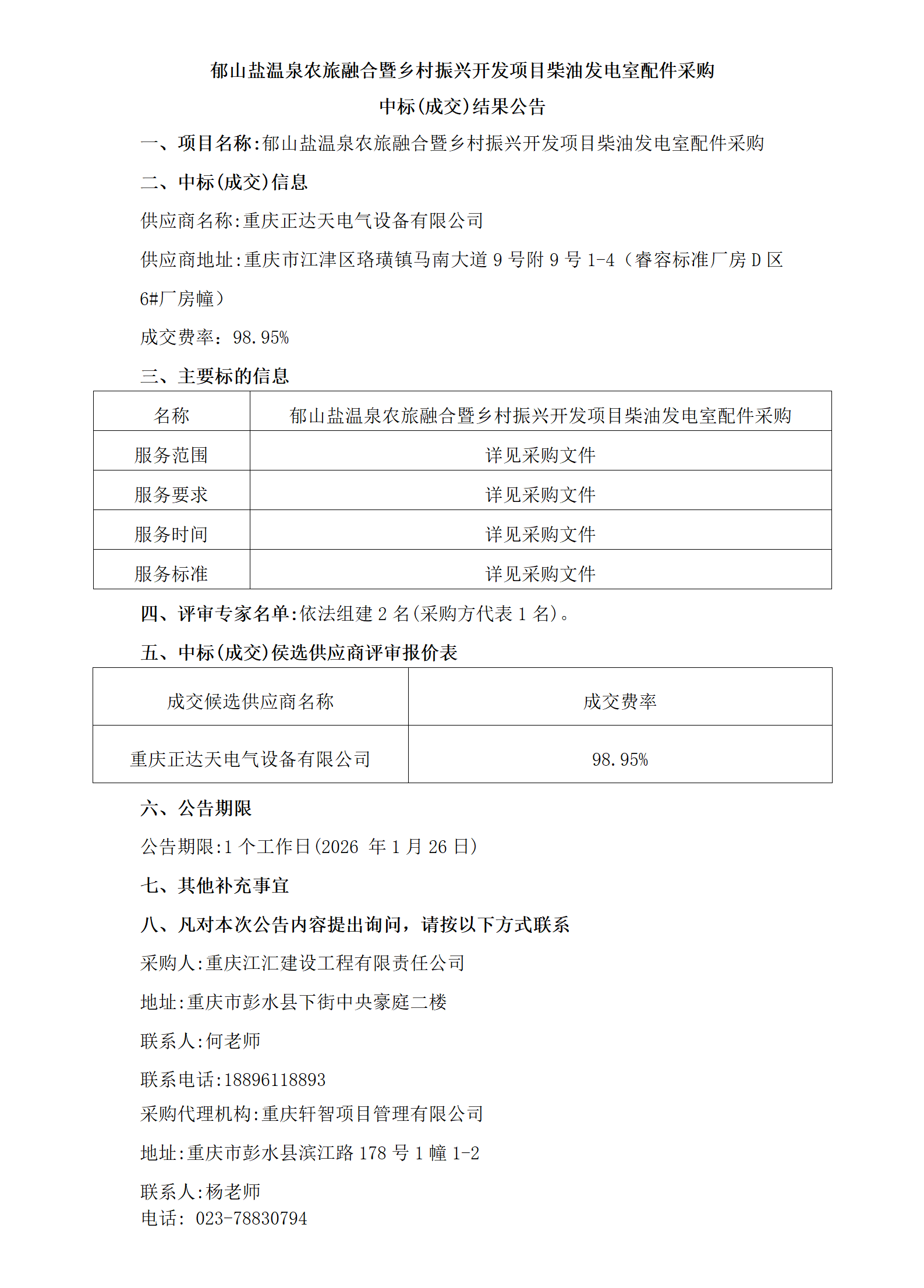 郁山盐温泉农旅融合暨乡村振兴开发项目柴油发电室配件采购中标(成交)结果公告
