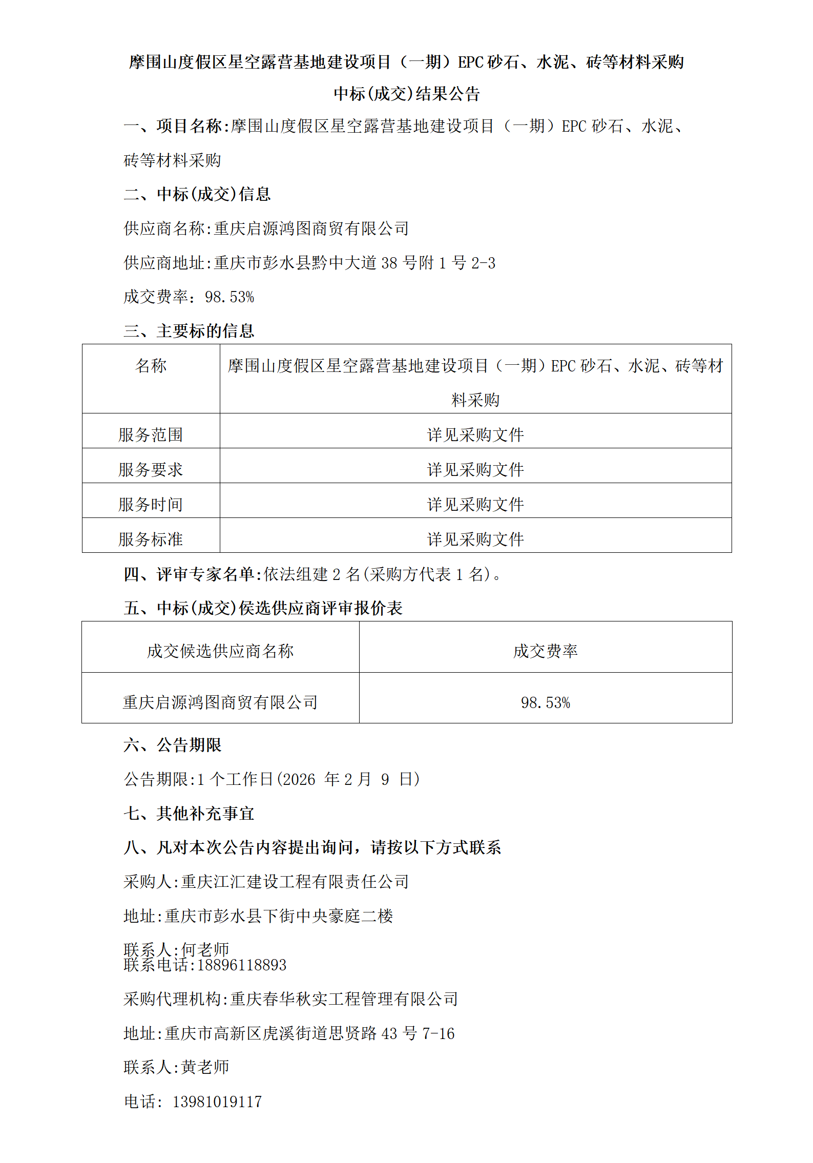 摩围山度假区星空露营基地建设项目(一期)EPC砂石、水泥、砖等材料采购中标(成交)结果公告