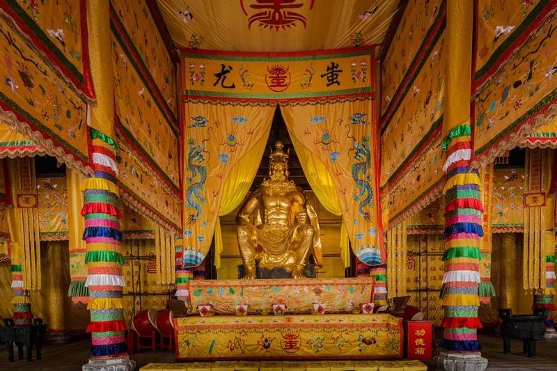 如前所述,在蚩尤大殿正中,供奉着纯青铜打造的蚩尤神像,座像高5.99米,长3.3米,宽1.9米,重达40吨。蚩尤塑像两边悬挂着两条龙,在苗族人的心目当中,蚩尤就是古天子,是苗族最早的天王。