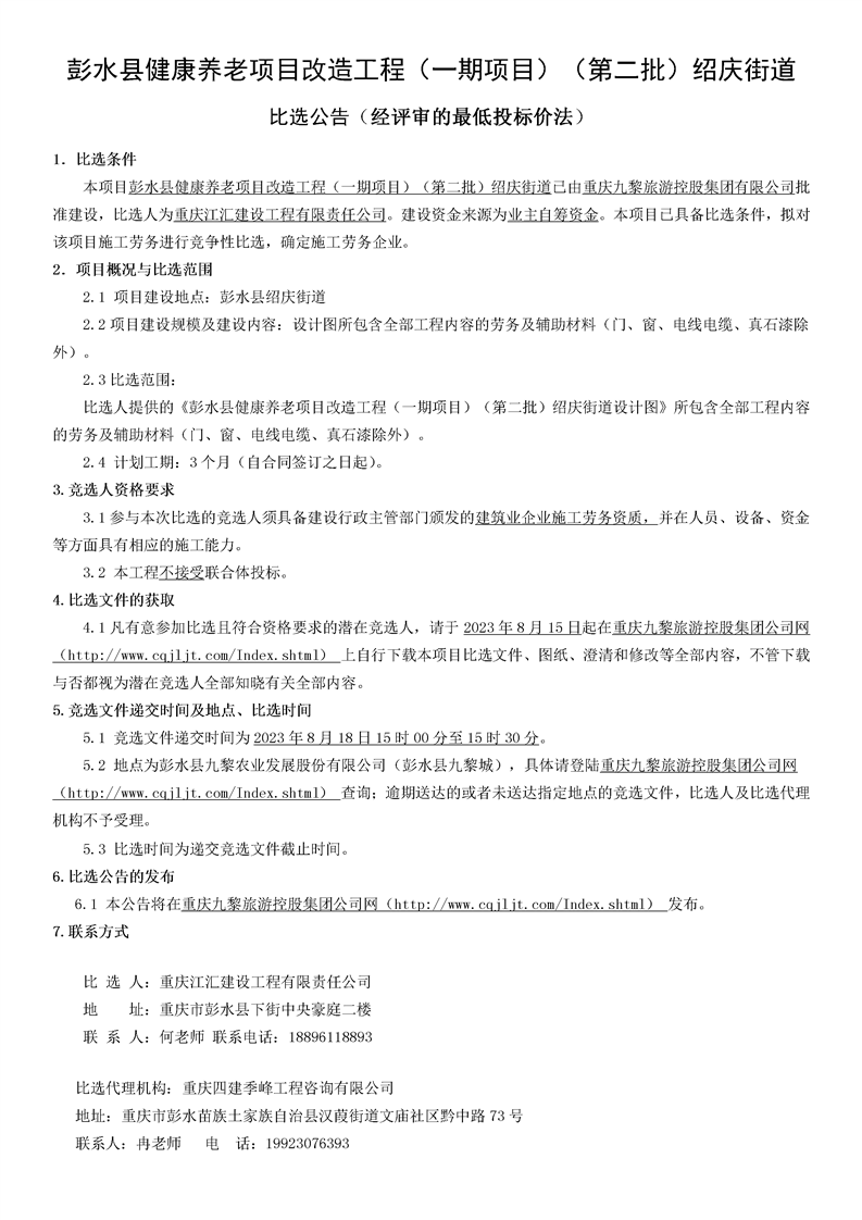 彭水县健康养老项目改造工程(一期项目)(第二批)绍庆街道 比选公告
