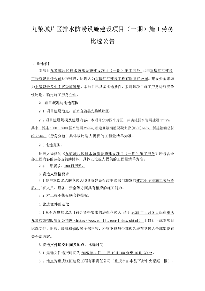 九黎城片区排水防涝设施建设项目(一期)施工劳务比选公告