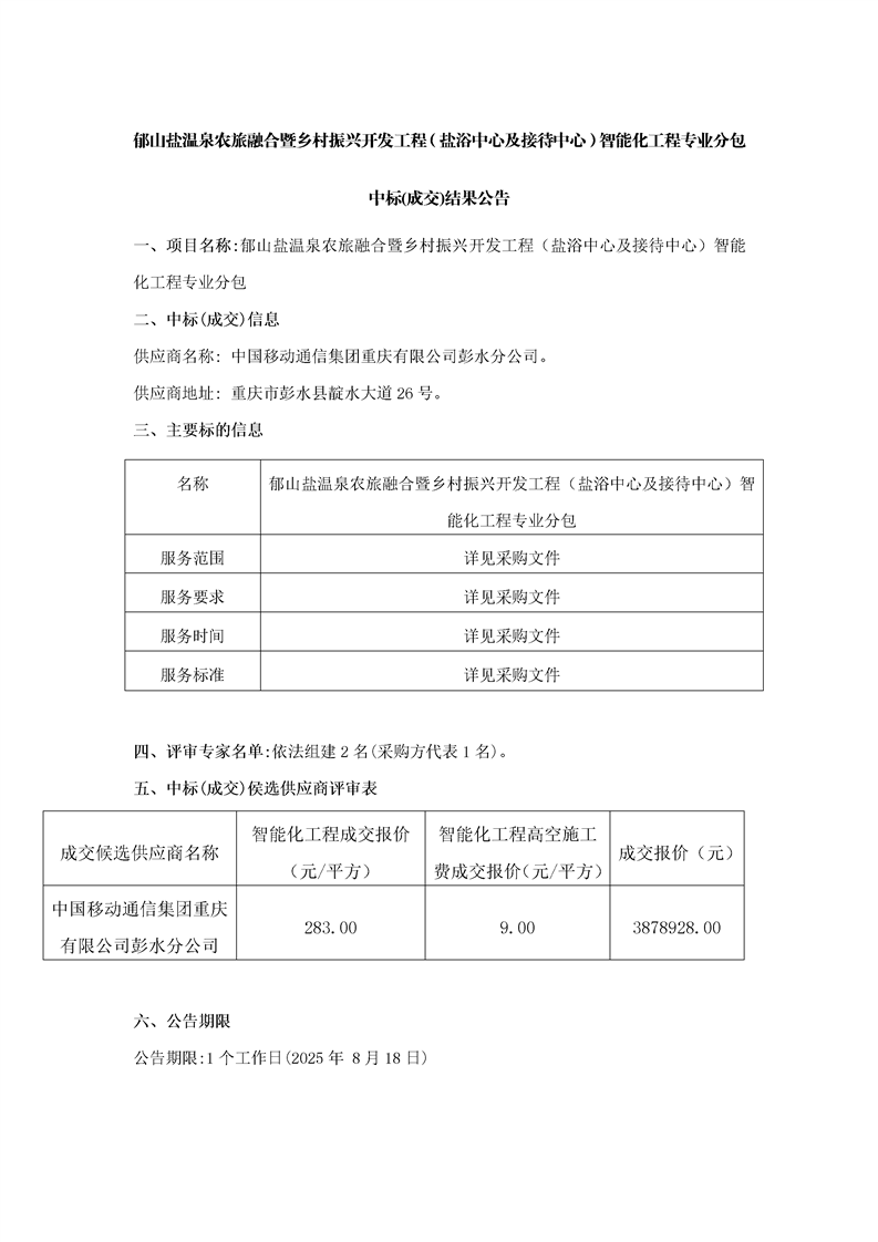 郁山盐温泉农旅融合暨乡村振兴开发工程(盐浴中心及接待中心)智能化工程专业分包中标(成交)结果公告