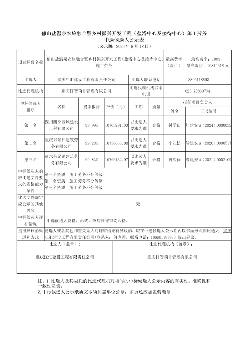 郁山盐温泉农旅融合暨乡村振兴开发工程(盐浴中心及接待中心)施工劳务中选候选人公示表
