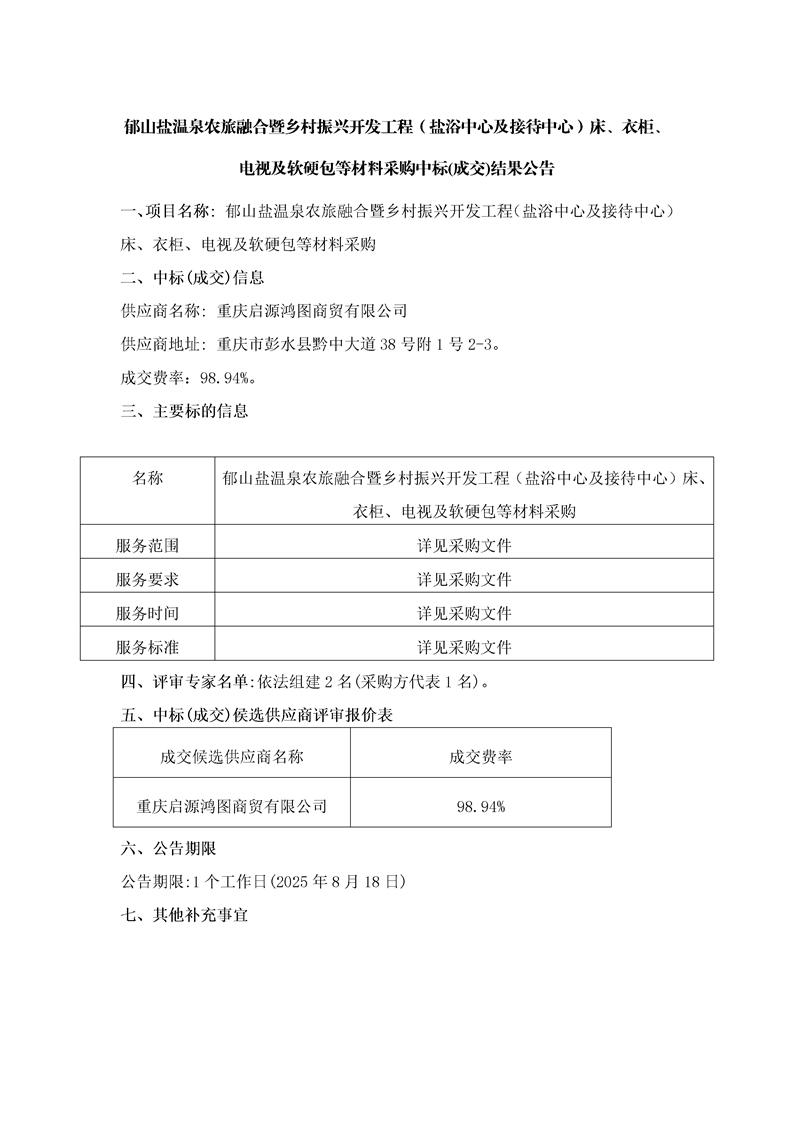 郁山盐温泉农旅融合暨乡村振兴开发工程(盐浴中心及接待中心)床、衣柜、电视及软硬包等材料采购中标(成交)结果公告