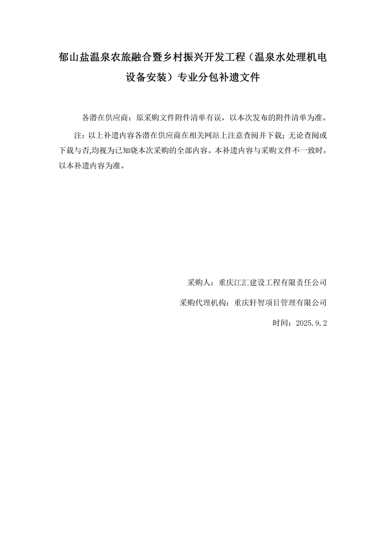 郁山盐温泉农旅融合暨乡村振兴开发工程(温泉水处理机电设备安装)专业分包补遗文件