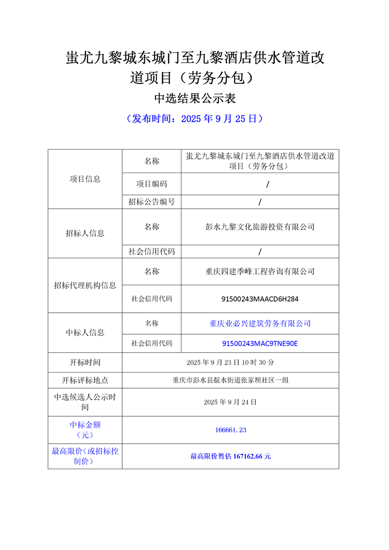 蚩尤九黎城东城门至九黎酒店供水管道改道项目(劳务分包) 中选结果公示表