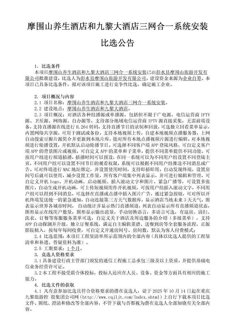 摩围山养生酒店和九黎大酒店三网合一系统安装比选公告