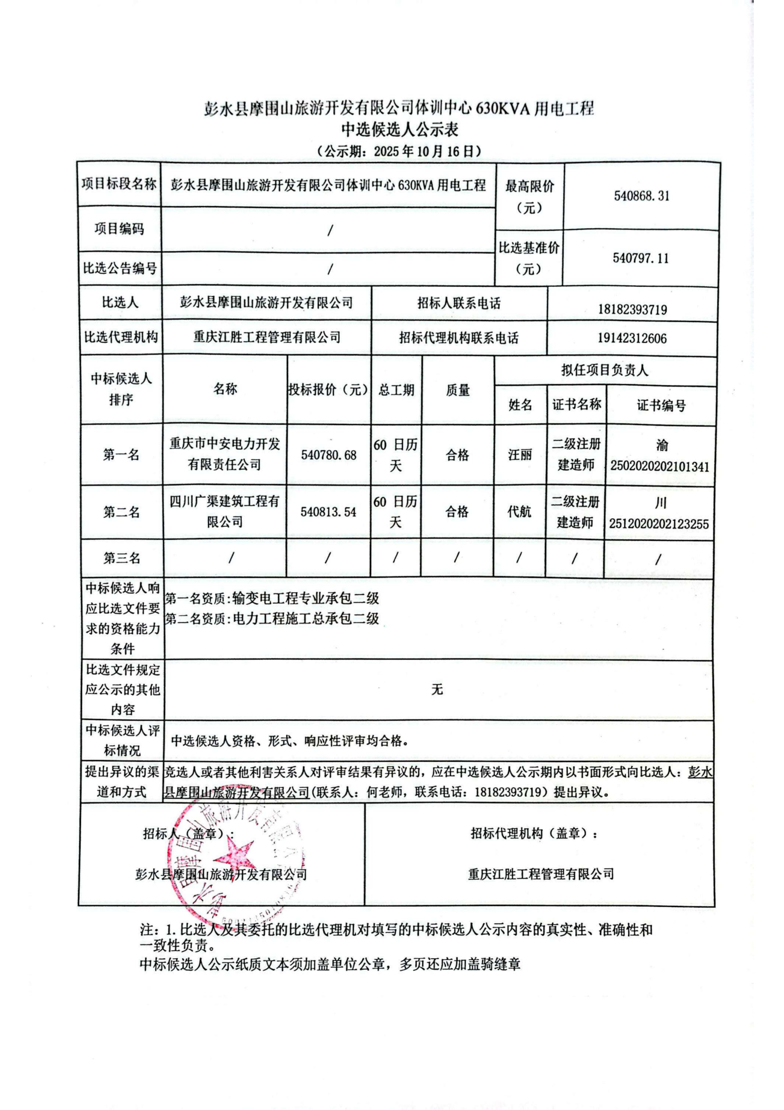 彭水县摩围山旅游开发有限公司体训中心630KVA用电工程中选候选人公示表
