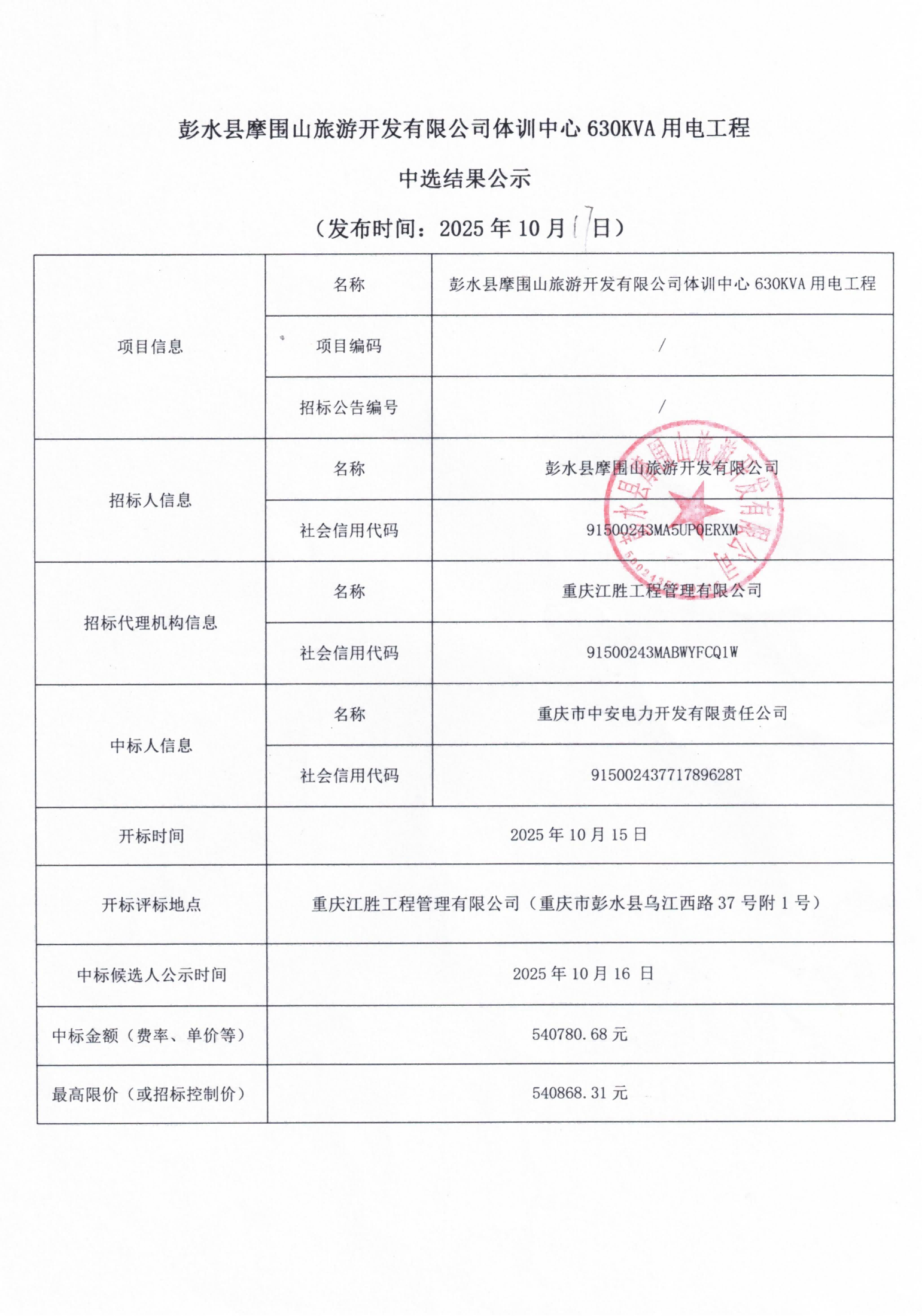 彭水县摩围山旅游开发有限公司体训中心630KVA用电工程中选结果公示