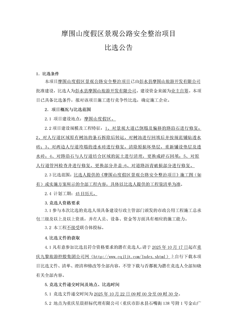 摩围山度假区景观公路安全整治项目比选公告