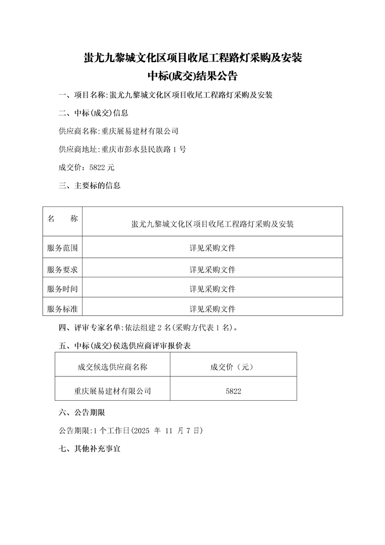 蚩尤九黎城文化区项目收尾工程路灯采购及安装中标(成交)结果公告