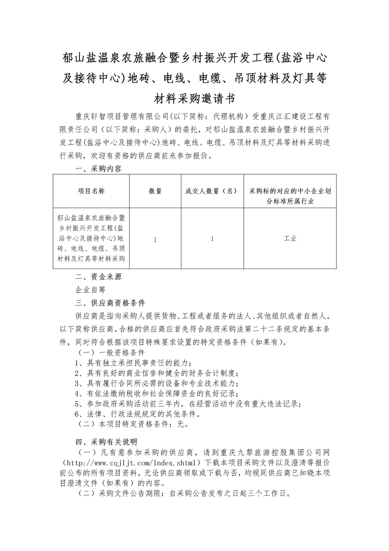 郁山盐温泉农旅融合暨乡村振兴开发工程(盐浴中心及接待中心)地砖、电线、电缆、吊顶材料及灯具等材料采购采购邀请书
