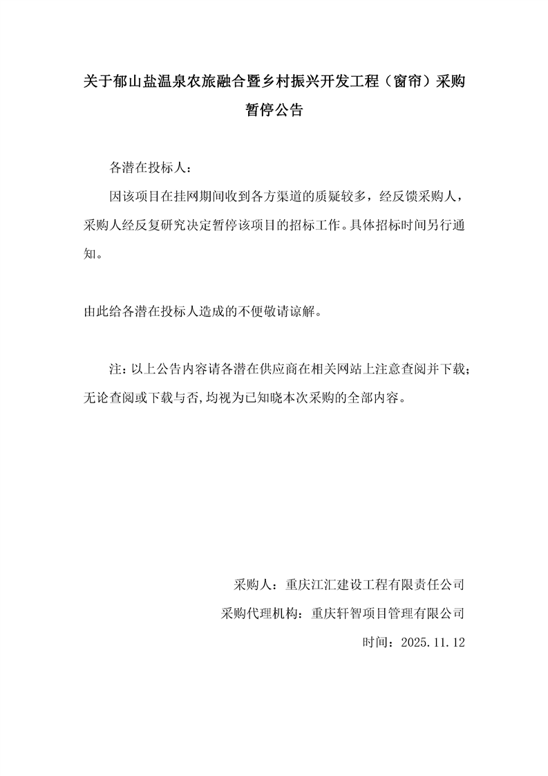 关于郁山盐温泉农旅融合暨乡村振兴开发工程(窗帘)采购暂停公告