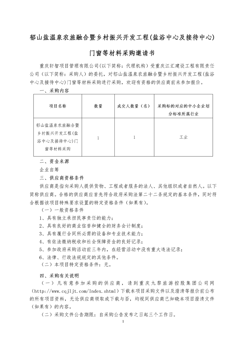 郁山盐温泉农旅融合暨乡村振兴开发工程(盐浴中心及接待中心)门窗等材料采购邀请书