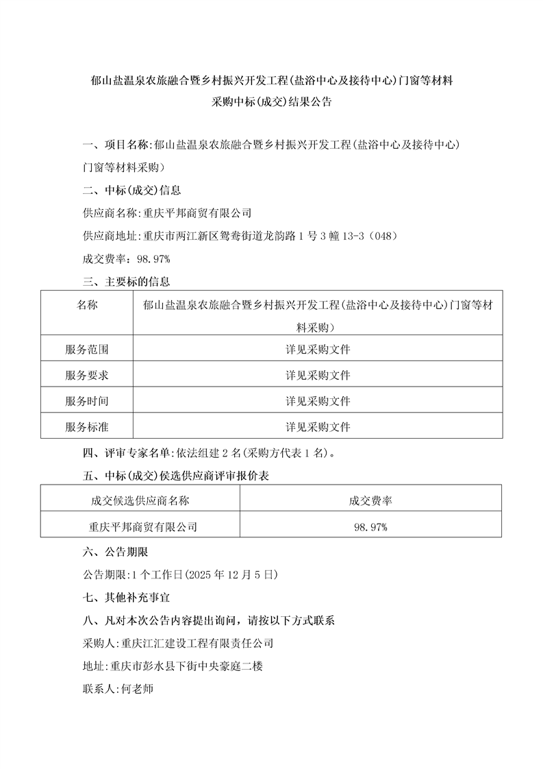 郁山盐温泉农旅融合暨乡村振兴开发工程(盐浴中心及接待中心)门窗等材料采购中标(成交)结果公告