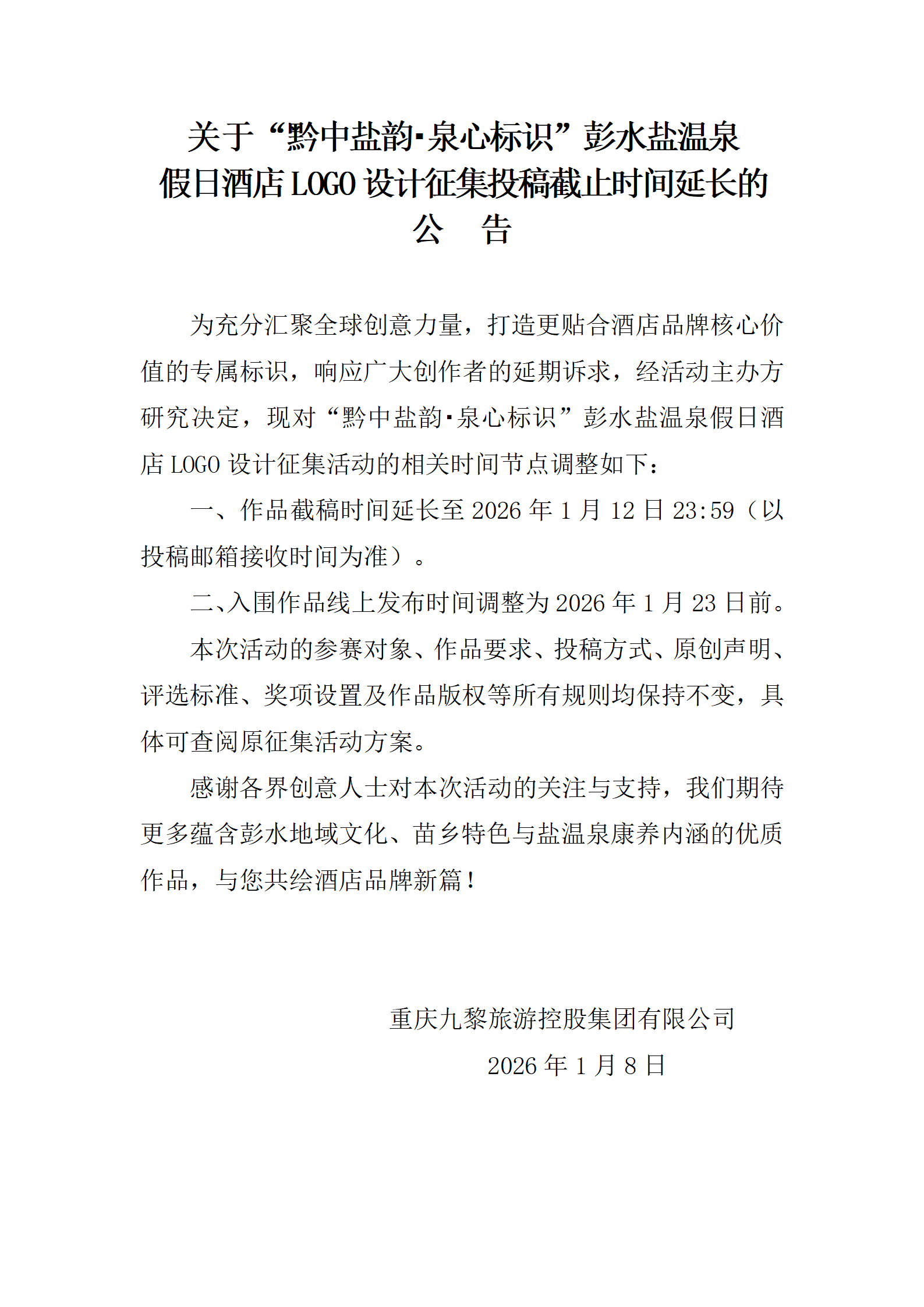 关于“黔中盐韵・泉心标识”彭水盐温泉假日酒店LOGO设计征集投稿截止时间延长的公告