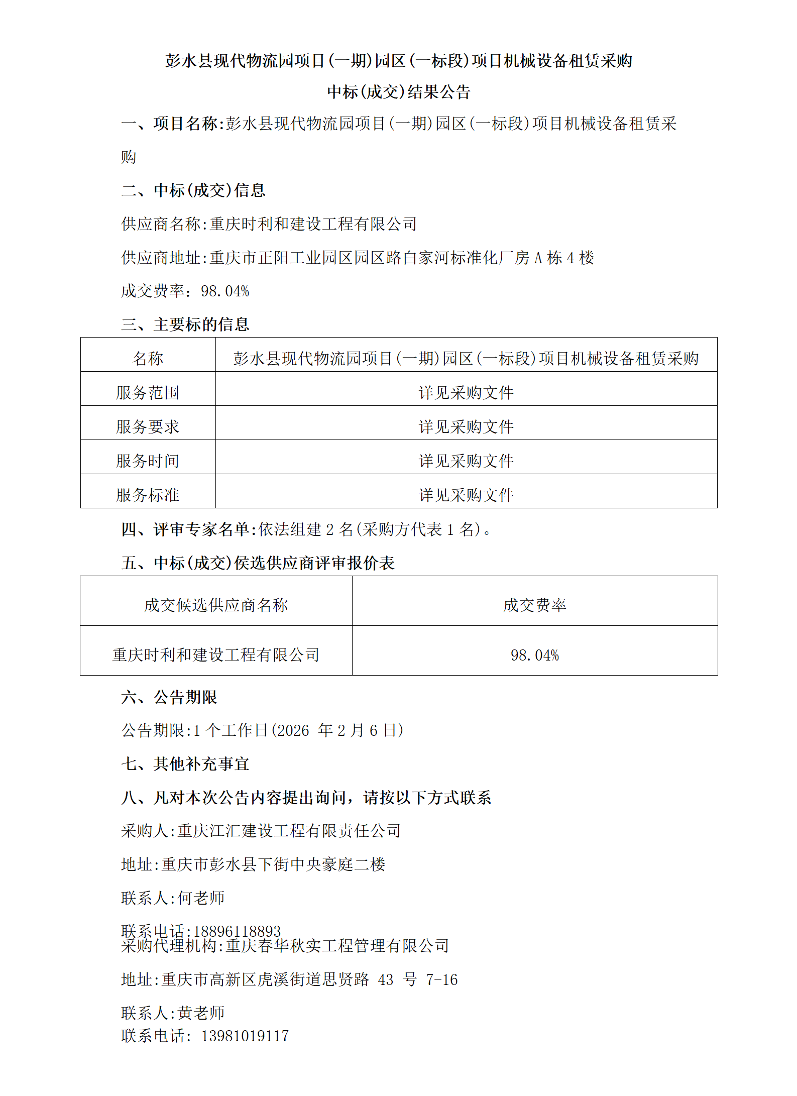 彭水县现代物流园项目(一期)园区(一标段)项目机械设备租赁采购中标(成交)结果公告