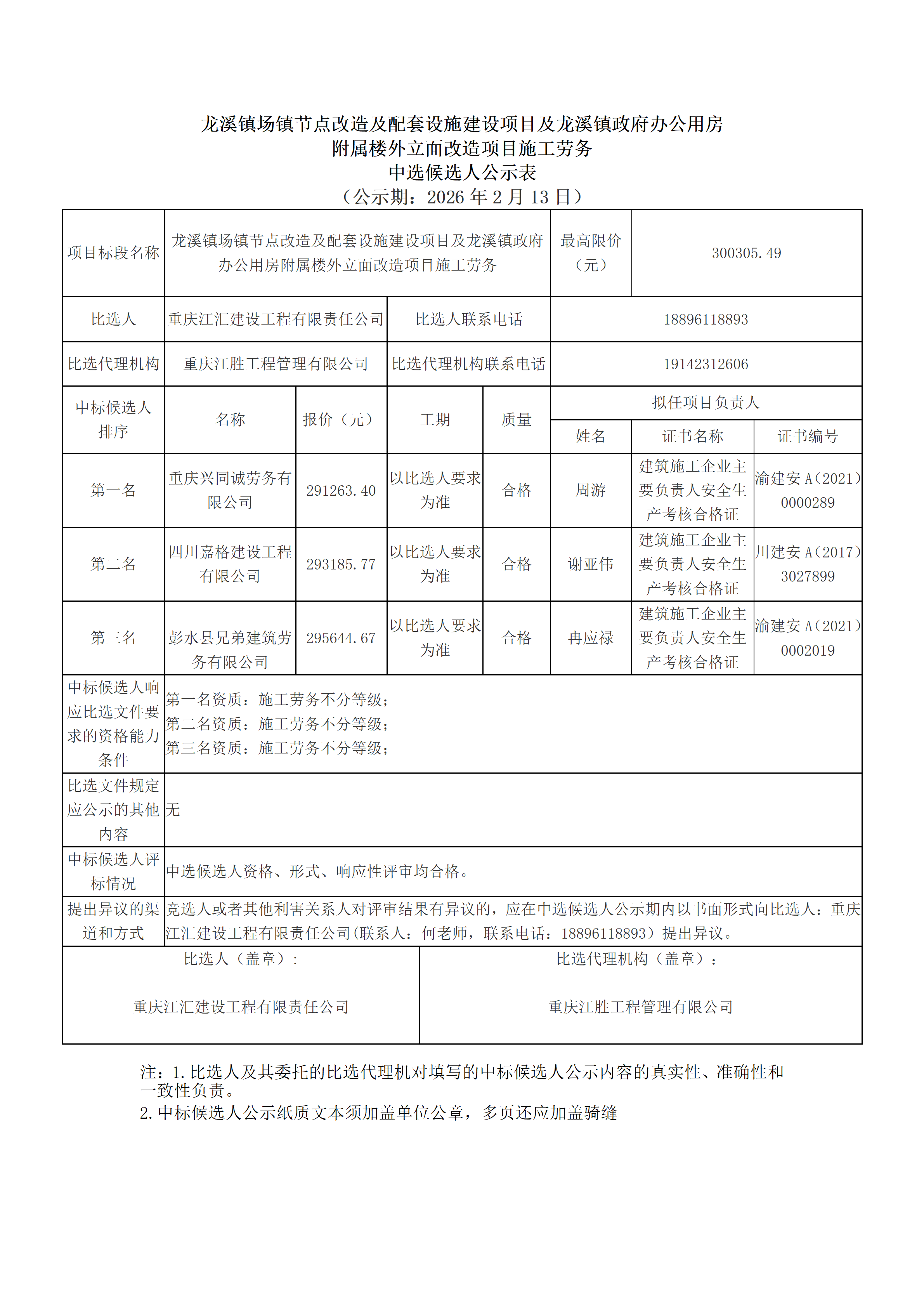 龙溪镇场镇节点改造及配套设施建设项目及龙溪镇政府办公用房附属楼外立面改造项目施工劳务中选候选人公示表