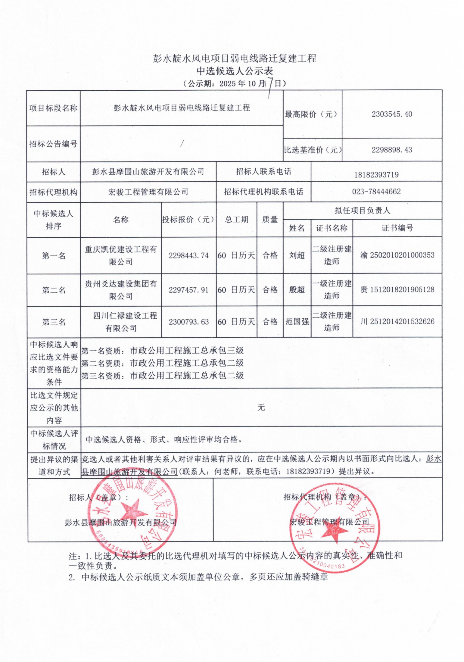 彭水靛水风电项目弱电线路迁复建工程中选候选人公示表